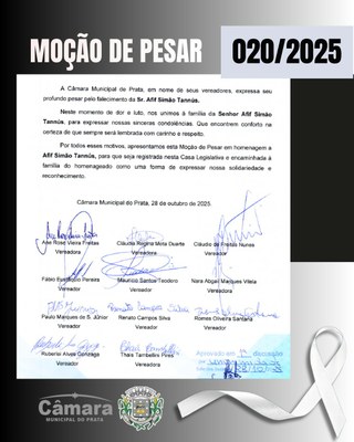 A Câmara Municipal aprovou, nessa semana, a Moção de Pesar 020/2025, de autoria de todos os vereadores, que lamenta o falecimento de Sr. Afif Simão Tannús.Confira o texto na íntegra:" MOÇÃO DE PESAR – 020/2025A Câmara Municipal de Prata, em nome de seus vereadores, expressa seu profundo pesar pelo falecimento do Sr. Afif Simão Tannús.Neste momento de dor e luto, nos unimos à família do Senhor Afif Simão Tannús, para expressar nossas sinceras condolências. Que encontrem conforto na certeza de que sempre será lembrado com carinho e respeito.Por todos esses motivos, apresentamos esta Moção de Pesar em homenagem a Afif Simão Tannús, para que seja registrada nesta Casa Legislativa e encaminhada à família do homenageado como uma forma de expressar nossa solidariedade e reconhecimento.Câmara Municipal do Prata, 28 de outubro de 2025."